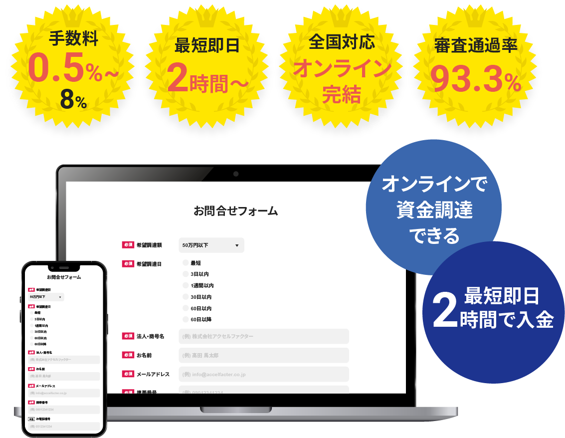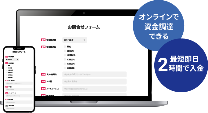 営業時間内かつご提出書類が揃っていれば、最短1時間で審査結果がでます。ただし審査の混雑状況や、お客さまの会社の状況によって審査時間が前後することもございますので、予めご了承ください。