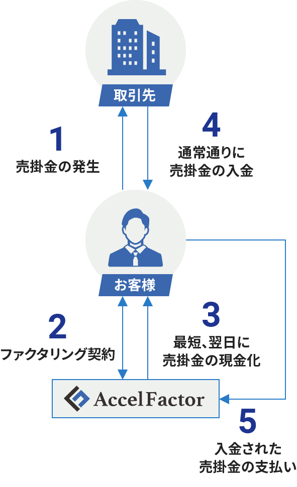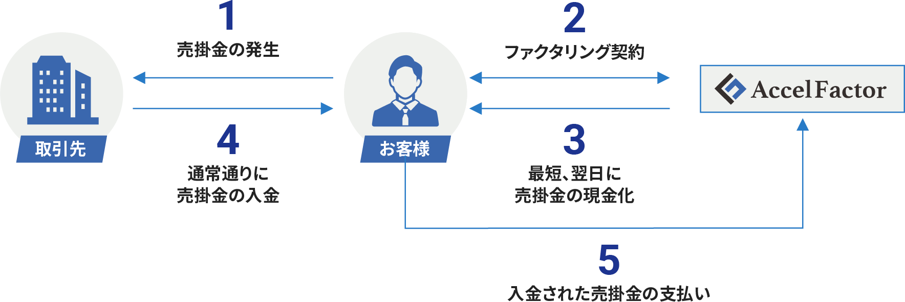売上の⼊⾦サイクルが遅れ、仕⼊れ先への⽀払いが難しくなってしまいました。アクセルファクターを利⽤することで、未回収の売掛⾦を早期に現⾦化でき、⽀払い期限を守ることができました。これにより、取引先との信頼関係を維持することができ、ビジネスの安定運営に⼤変役⽴ちました。